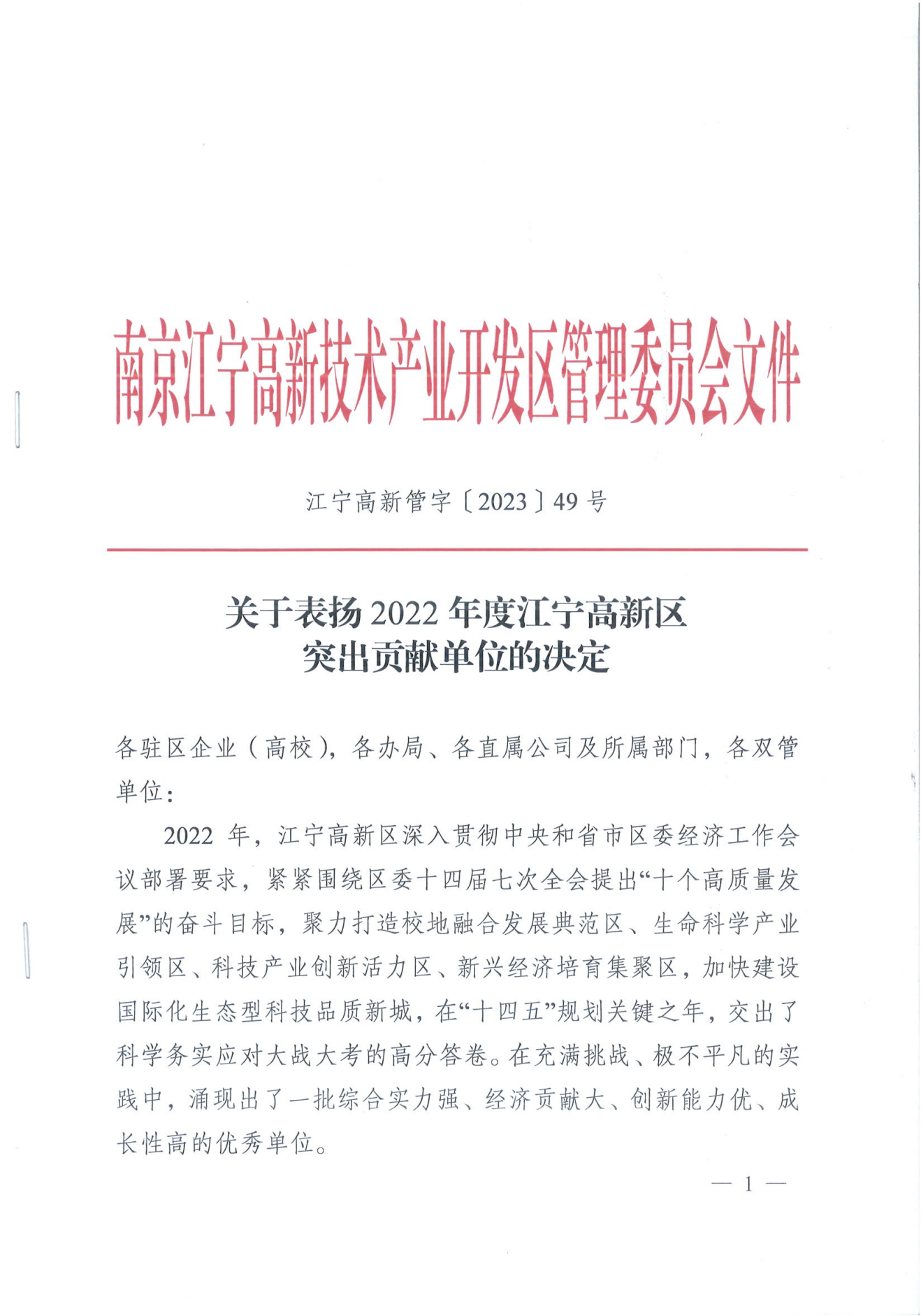 By launching this commendation list, Nanjing Jiangning Hi-tech Development Zone thoroughly implements the deployment requirements of the Central Economic Work Conference and the economic work conferences of the CPC committees of Jiangsu Province, Nanjing City and Jiangning District, focuses on the goal of “high-quality development in 10 areas” proposed at the 7th Plenary Session of the 14th CPC Jiangning District Committee, praises exemplars and “meritorious deeds” and energizes enterprises. This commendation represents an honour given to the management teams of 58 units in the Zone.